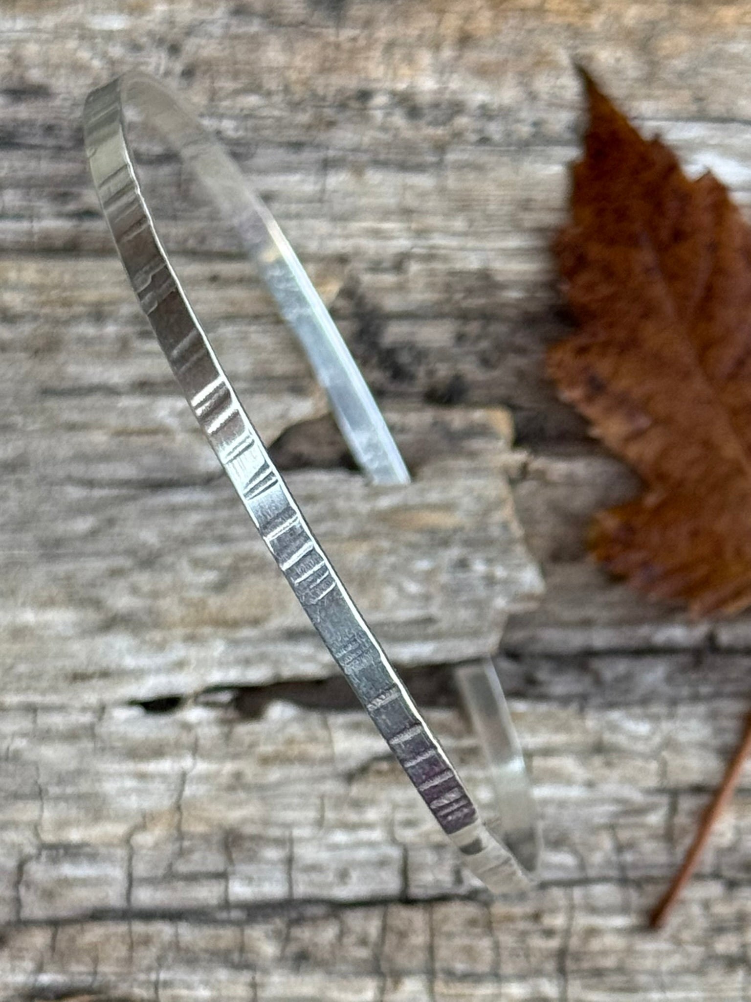 This bangle is created with 3mm flat wire in sterling silver. A distinctive vertical stripe texturing was achieved with a hammer. The minimalist aesthetic makes it versatile to wear alone or stack with other bracelets.