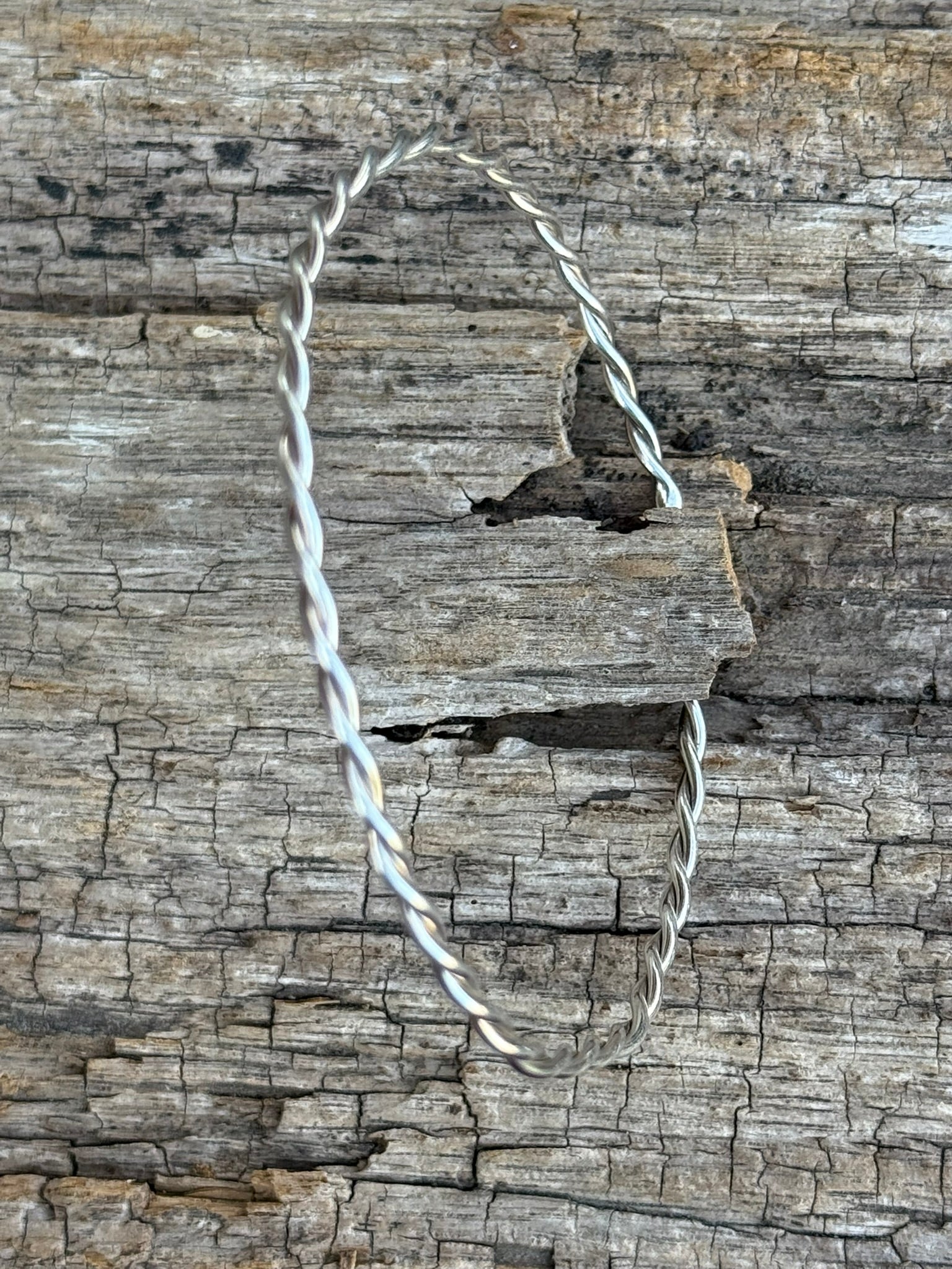 The classic bangle, with a twist! Two round wires in sterling silver are twisted together. It is perfect alone or stacked with other styles of bangle.